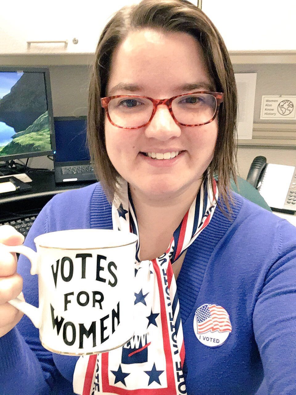 You asked for selfies, and I thought you might especially enjoy the scarf I wore today. My partner’s grandmother is 96 years old and has been an active member of the League of Women Voters in Montgomery County, MD for over twenty years. She gave me this scarf last week and I knew I had to wear it today.