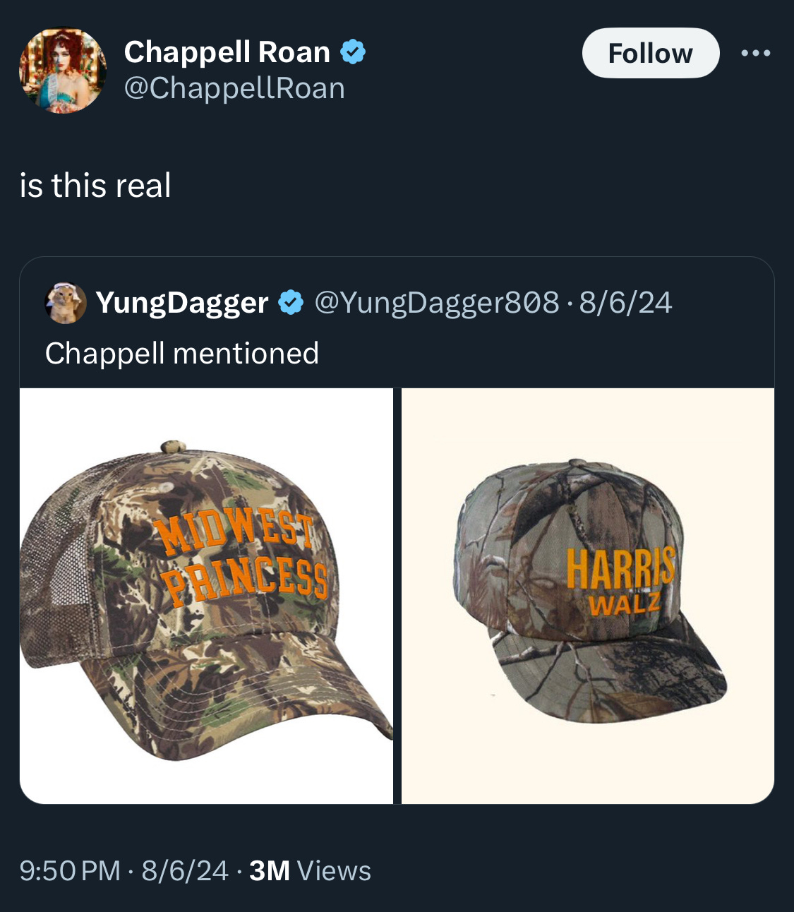 “I have so many issues with our government in every way,” [Chappell Roan] says. “There are so many things that I would want to change. So I don’t feel pressured to endorse someone. There’s problems on both sides. I encourage people to use your critical thinking skills, use your vote – vote small, vote for what’s going on in your city.” (source)